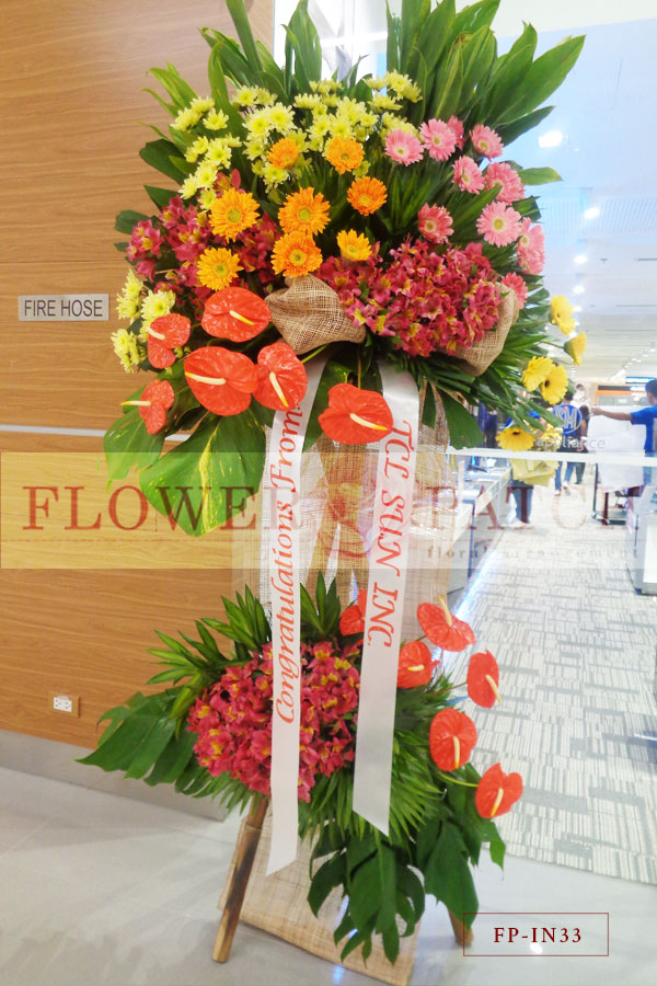Standing Arrangement of Gerberas, Mums, Anthriums and Heliconias