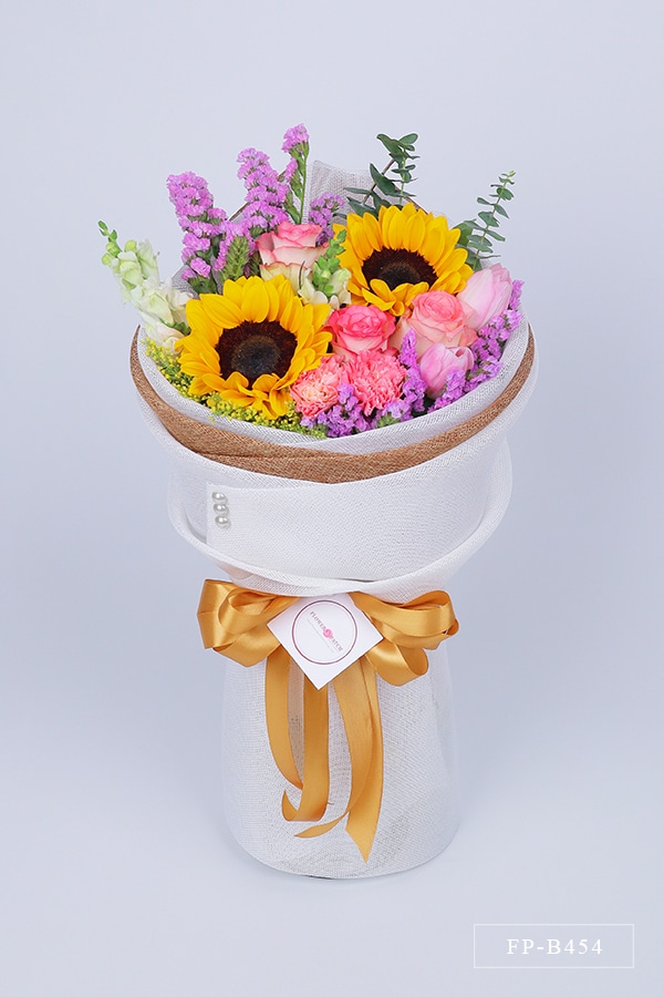 Bouquet of 2 Sunflowers, 2 Tulips, 2 Carnations and 3 Imported Roses